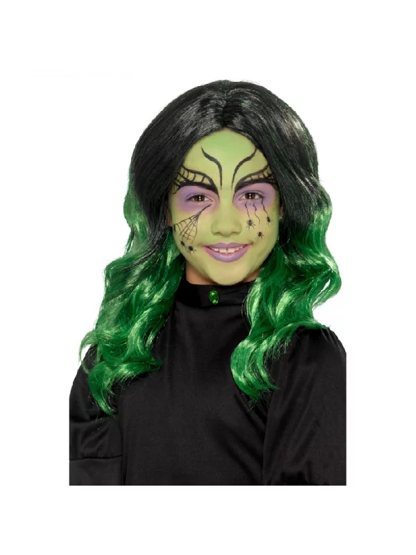 La perruque longue ondulée est de couleur noire avec des mèches verte et est destinée aux filles.