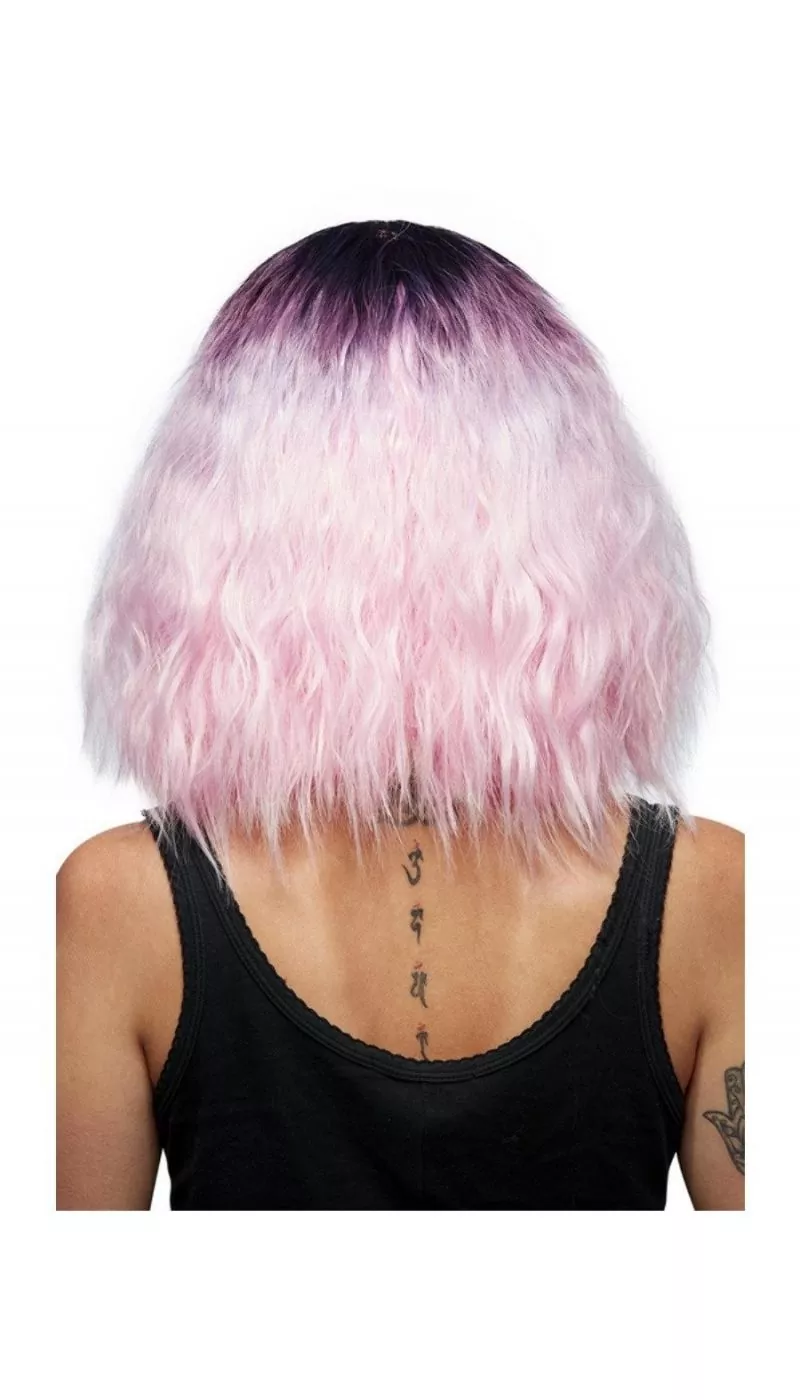 Changer de look avec la Perruque Manic Panic, elle est rose pastel avec des racines foncées et elle présente une frange.