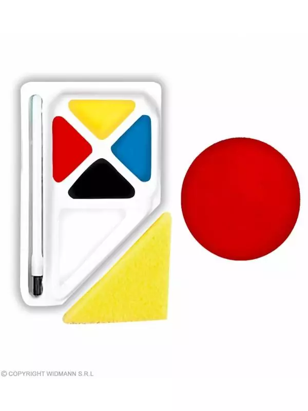 Voici une palette de maquillage qui comprend l’essentiel en terme de couleurs et en prime un nez rouge en éponge.
